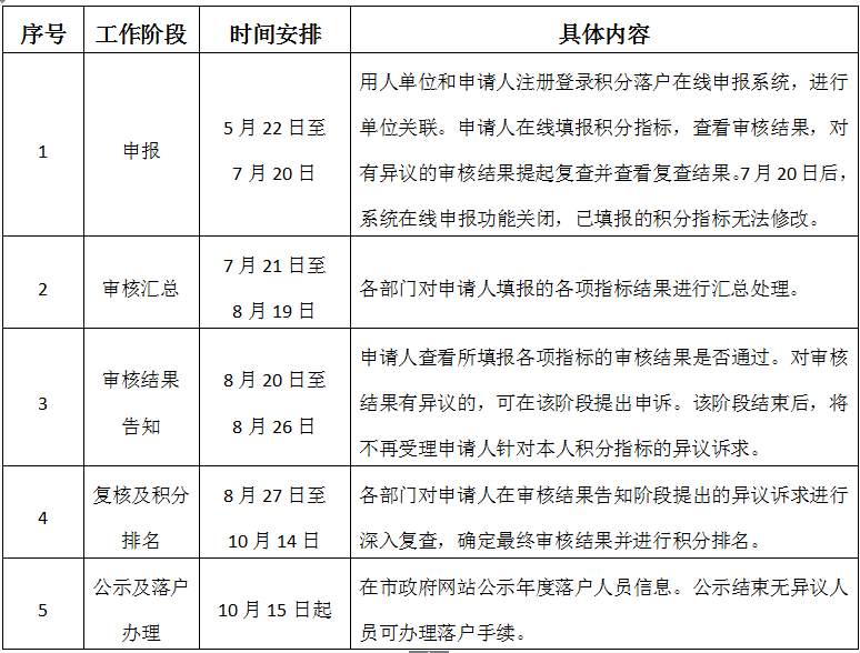 本市2019年积分落户工作5月22日启动申报,共分为申报、审核汇总、审核结果告知、复核及积分排名、公示及落户办理5个阶段,其中需要全体申请人直接参与的是申报阶段和审核结果告知阶段。各阶段具体安排如下: