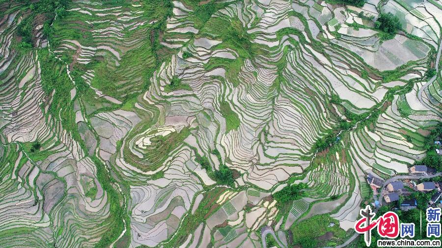 2019年5月18日,航拍的重庆市酉阳土家族苗族自治县花田乡何家岩村梯田。陈碧生/摄 东方IC