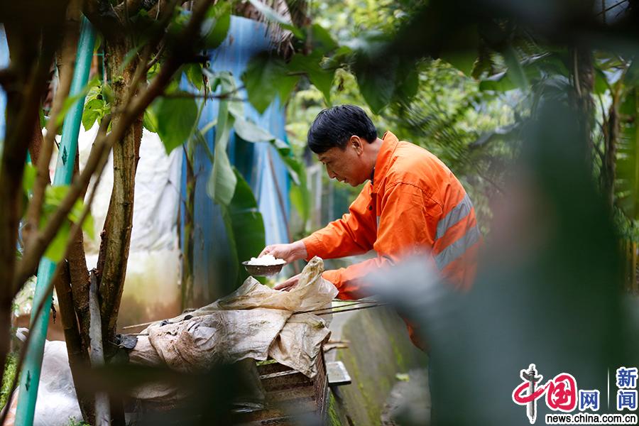 工区里食用的蔬菜基本都是工友们自己种的,还饲养了一些家禽,大家一般都会将剩菜剩饭拿来喂鸡鸭。中国网发 丁波/摄