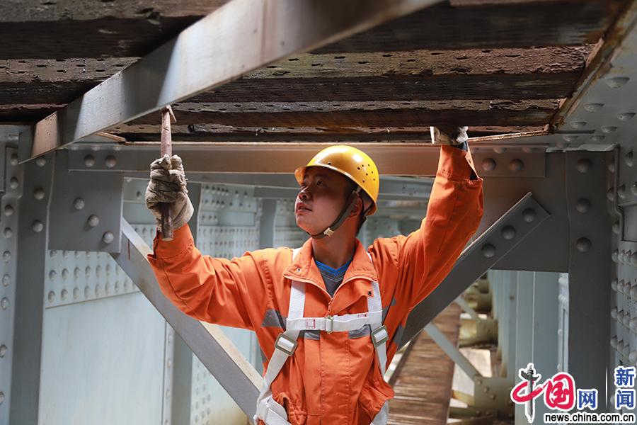 敲击辨音是检查铁路桥梁框架是否有病害的一种方法,每一个连接部位和承重区域乐伟文都不会放过,敲多了,听久了,他找到了自己的节奏和旋律,让枯燥的工作变得有乐趣。中国网发 徐国栋/摄