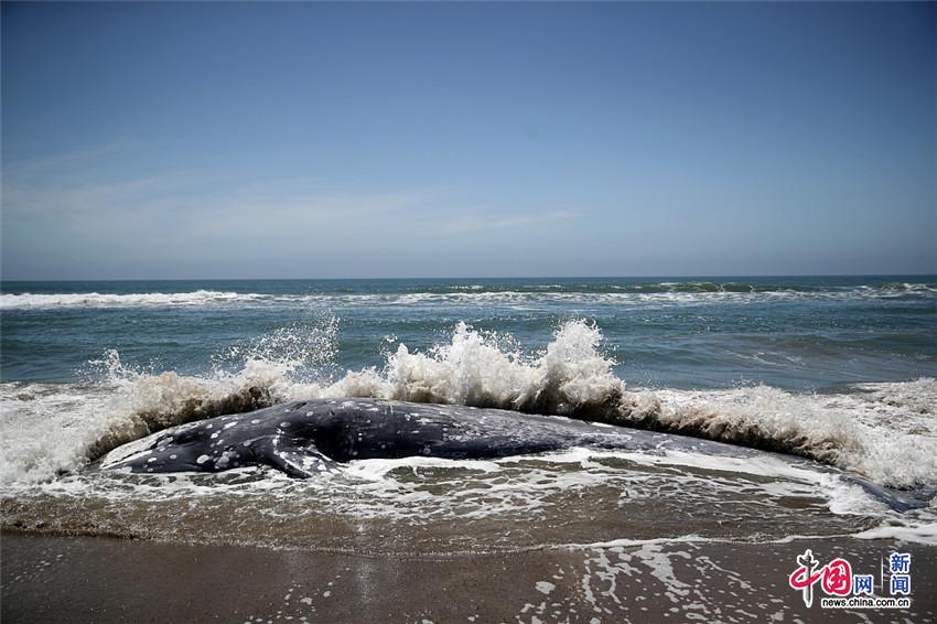 当地时间2019年5月23日,美国加利福尼亚州,一头死亡的灰鲸被冲到旧金山湾区的海滩上。今年年初以来,在加利福尼亚州和华盛顿之间的太平洋沿岸陆续发现了数十头灰鲸的尸体,科学家们正试图找到这些鲸鱼的死亡原因。STEPHEN LAM/视觉中国