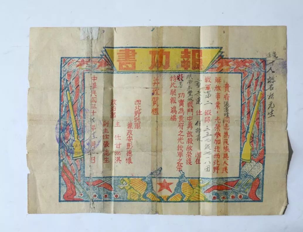 薄薄的纸片,边角已经磨损,几道深深的折痕,像是它主人身上永远留下的伤疤,需要用透明胶带粘合,才能保持它的完整。尽管如此,纸上的色彩依旧鲜艳,那用红色字体书写的报功文依然清晰: