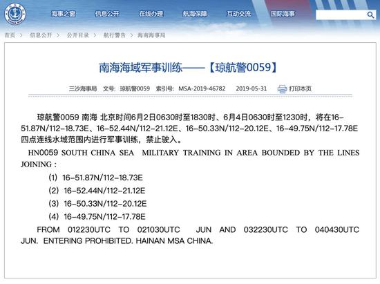 5月31日,中国海事局发布琼航警0059号公告。