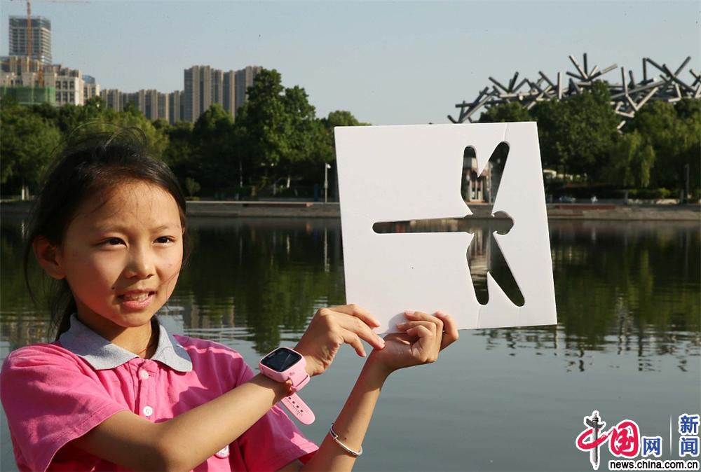 2019年6月3日,合肥,塘西河沙滩公园,世界环境日主题活动:“捕捉大自然”,孩子们拿着形态各异的轮廓剪影板,去寻找和板上造型最匹配的环境。(牛国梁 摄/视觉中国)