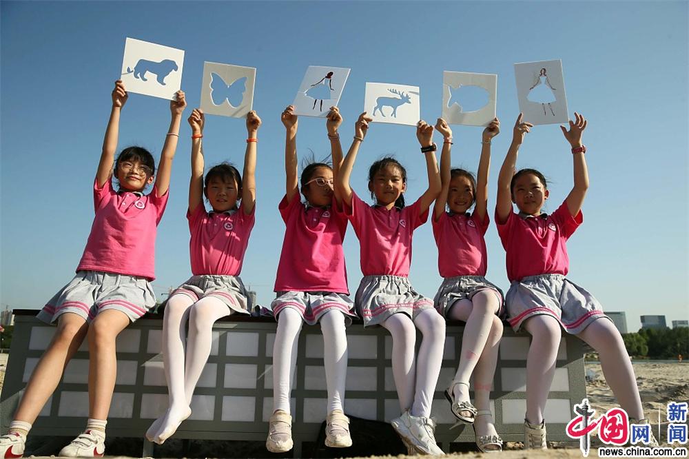 2019年6月3日,合肥,塘西河沙滩公园,世界环境日主题活动:“捕捉大自然”,孩子们拿着形态各异的轮廓剪影板,去寻找和板上造型最匹配的环境。(牛国梁 摄/视觉中国)