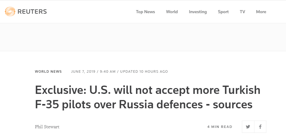 报道称,美国表示,土耳其不能同时拥有这两者(S-400导弹防御系统和F-35型战斗机)。但迄今为止美国一直没有采取措施限制或停止项目内土耳其飞行员的培训。