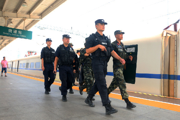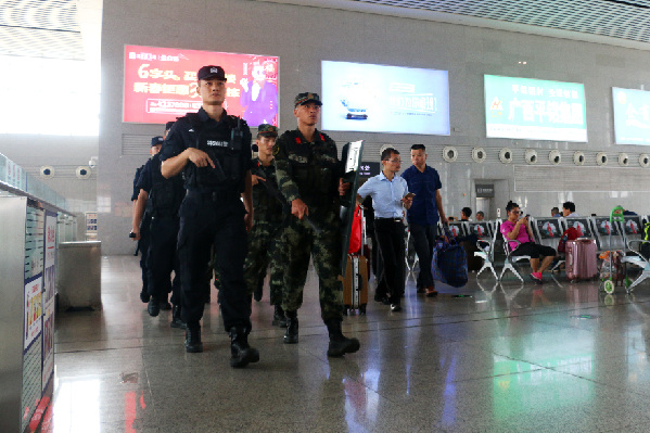 7日,公安特警与武警官兵在火车站候车大厅巡逻。