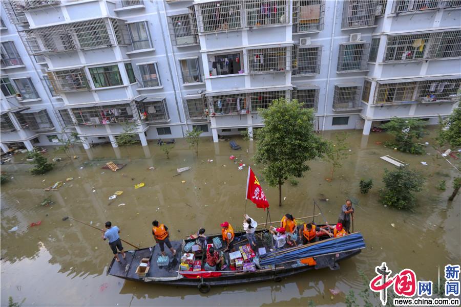 6月10日,在江西省峡江县巴邱镇,党员突击队员在给灾民运送食品。(图片来源:东方IC)