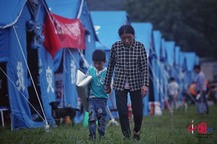 2019年6月18日下午6时许,位于双河中学校操场的灾民安置点秩序井然。这里的灾民被妥善安置,安置点除了提供帐篷饮食等灾民的基本需求外,还提供移动充电宝等,同时还设有露天电影院。(图/IC photo)