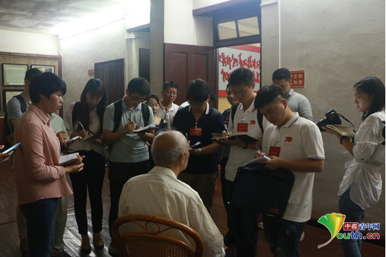 曾晨英(左一)和父亲(中)为记者讲述宁都革命历史。中国青年网记者 方瑞 摄