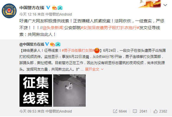 6月24日,一段女子在街头遭男子凶残踢打的视频流传。6月25日,@中国警方在线 发布消息称,目前警方正在工作,因此为没有明显标志建筑的夜间视频,尚未找到源头。发挥网友力量,共同揪出此人。
