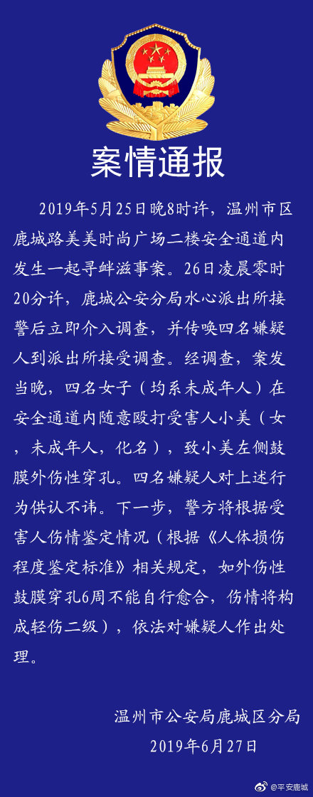 6月27日凌晨,浙江省温州市公安局鹿城区分局发布案情通报,2019年5月25日晚8时许,温州市区鹿城路美美时尚广场二楼安全通道内发生一起寻衅滋事案。26日凌晨,警方接警后立即介入调查,并传唤四名嫌疑人到派出所接受调查。经调查,案发当晚,四名女子(均系未成年人)在安全通道内随意殴打受害人小美(女,未成年人,化名),致小美左侧鼓膜外伤性穿孔。四名嫌疑人对上述行为供认不讳。