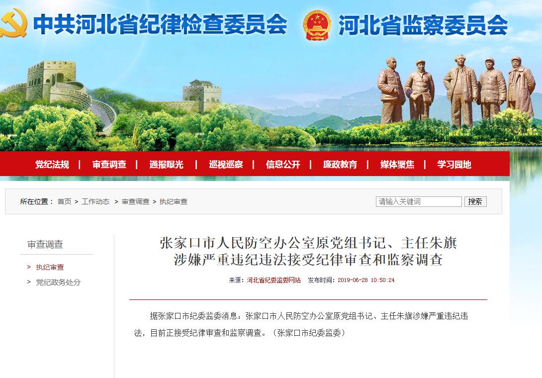 中国网6月28日讯 据河北省纪委监委网站消息,张家口市人民防空办公室原党组书记、主任朱旗涉嫌严重违纪违法,目前正接受纪律审查和监察调查。