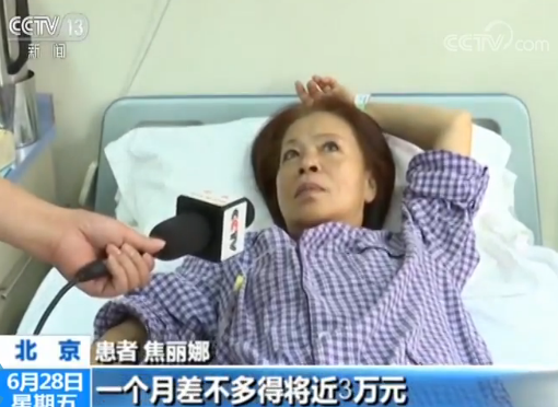 患者 焦丽娜:刚开始2017年化疗用贝伐单抗全都是自费,一个月差不多得3万元,现在一个月自费一两千块钱吧。