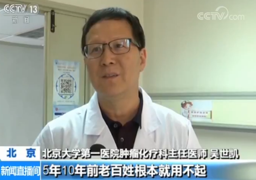 北京大学第一医院肿瘤化疗科主任医师 吴世凯:5年10年前老百姓根本就用不起,我们(医生)就只能去妥协,去用那个效果低的副反应大的这种(药)治疗,现在能用的起了。