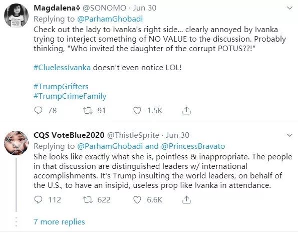 不仅如此,伊万卡还在尝试着与特蕾莎·梅以及马克龙互动,不断附和着马克龙和梅的观点。