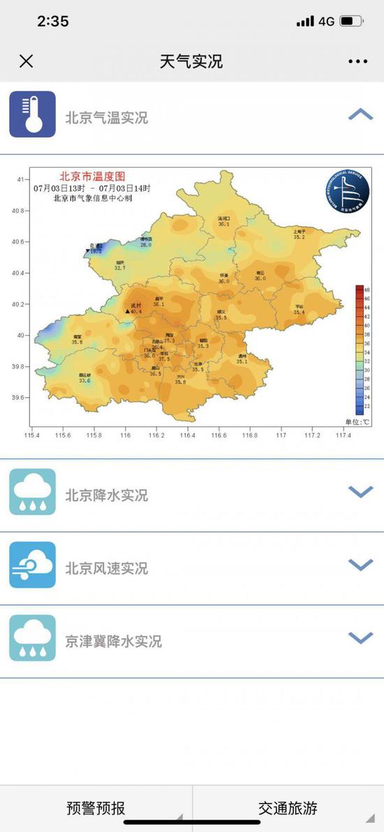 与前两天最高气温均未“达标”不同,今天中午13-14时,除了延庆外,北京大部分地区的气温已经超过35℃的高温线。