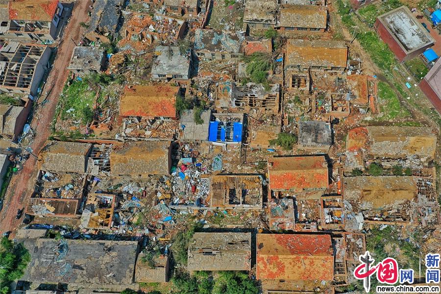 2019年7月4日,辽宁开原,航拍龙卷风过后受灾的平房。图/视觉中国