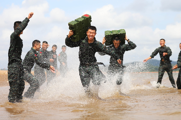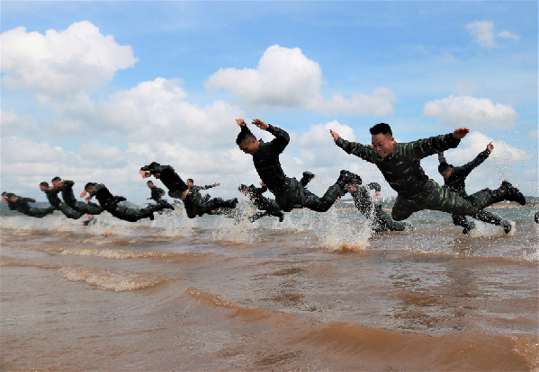 5日,武警广西总队钦州支队组织特战队员在驻地附近海域开展极限体能训练,全面提高特战队员在恶劣环境和复杂条件下的技战术水平。(余海洋 摄影报道)