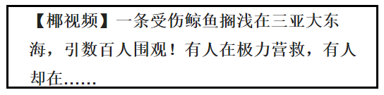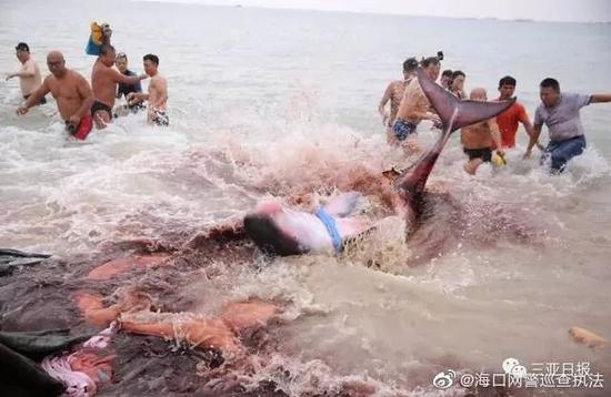 随后,记者向有关部门了解到,网传视频实为2017年一条受伤鲸鱼搁浅在三亚大东海,三亚海洋与渔业局、中科院深海所、三亚红沙边防派出所等部门的工作人员现场救援,被一些市民游客拍摄的。