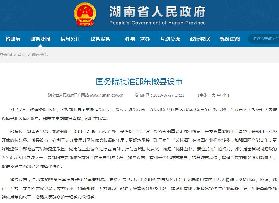中国网7月27日讯 据湖南省政府办公厅消息,7月12日,经国务院批准,民政部批复同意撤销邵东县,设立县级邵东市,以原邵东县行政区域为邵东市的行政区域,邵东市人民政府驻大禾塘街道兴和大道288号。邵东市由湖南省直辖,邵阳市代管。