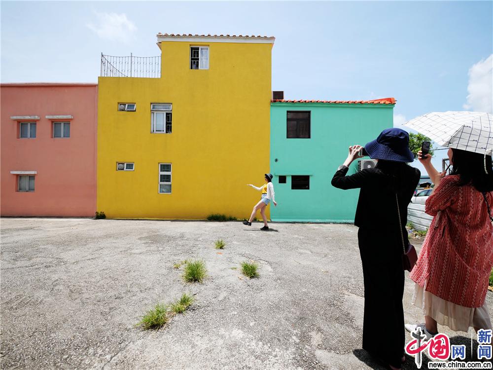 2019年7月27日,澳门特别行政区,澳门十月初五马路有一片居民楼房外墙涂上多种色彩被网友在抖音、小红书称为“马卡龙”网红墙成为游客打卡热点。IC photo/摄