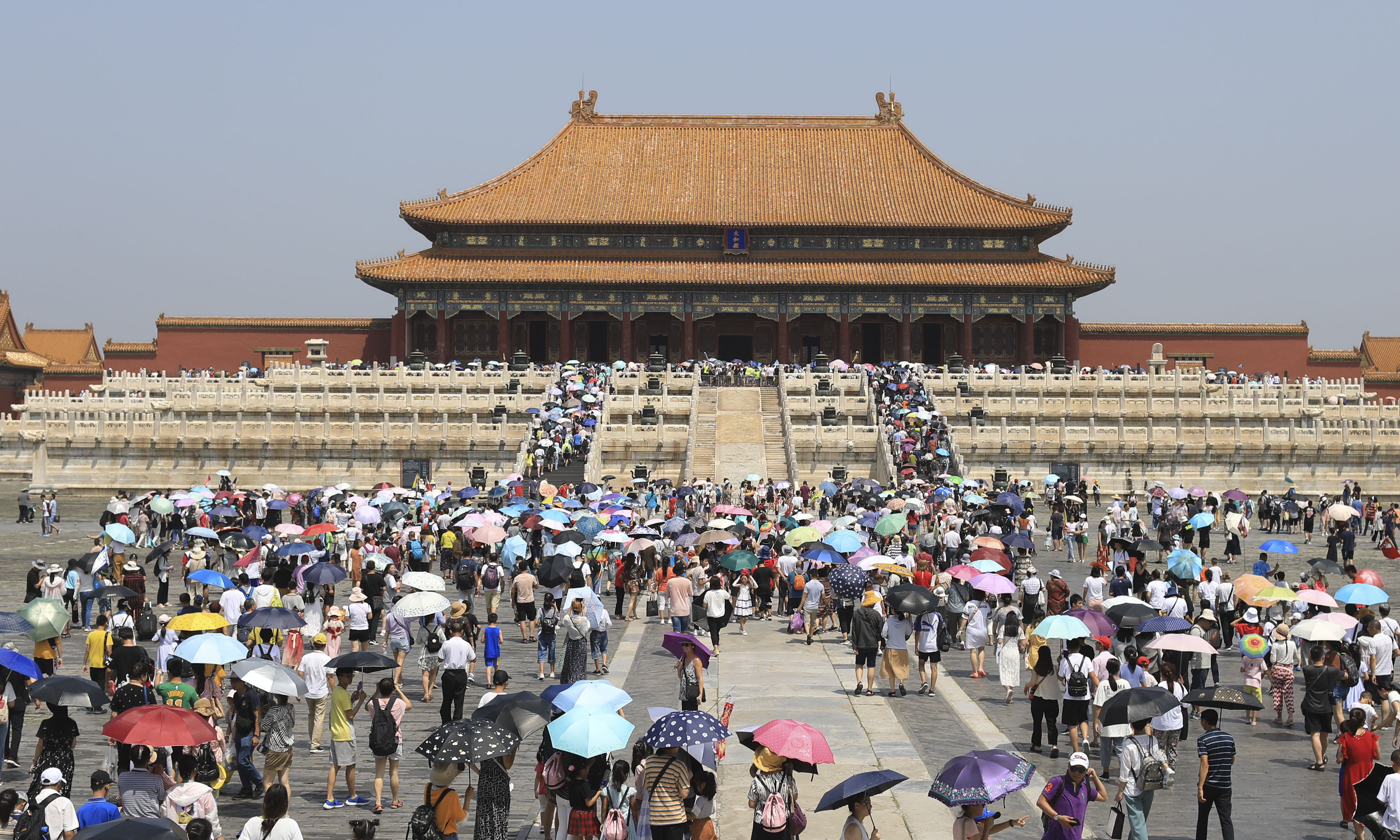 2019年7月30日,游客在高温下游览故宫,太和殿前满是游客。