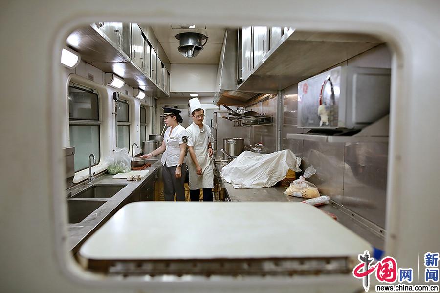 K358次列车长姚怡在列车运行途中对餐车食品卫生进行检查。
