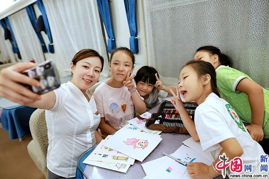 K358次列车长姚怡在餐车内用手机和几位可爱的小朋友一起自拍。