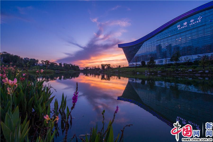 成都雨后天晴惊现美丽日落景象,全球最大单体建筑——环球中心披上了一层金黄色的外衣。IC photo/摄