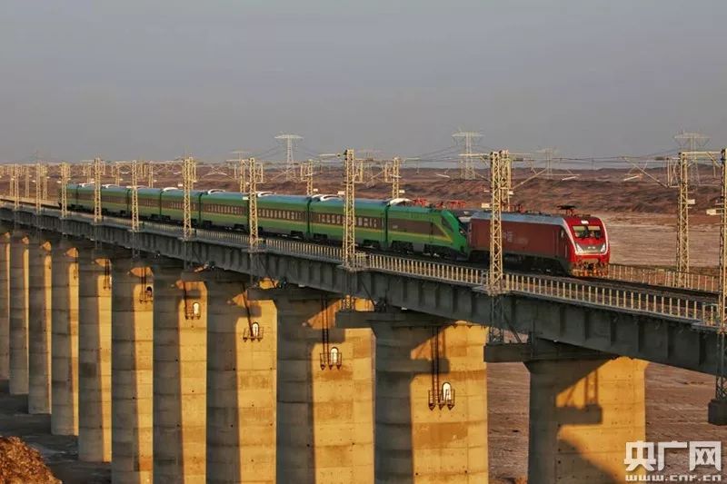 被网友叫做“绿巨人”的CR200J动车组,驶过甘肃、新疆交界的兰新铁路红柳河大桥