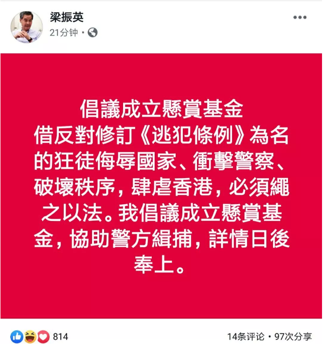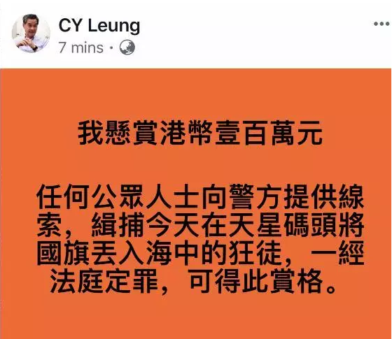 随后,梁振英更是发布了一条“悬赏令”,悬赏100万港元向公众征集线索,他在帖文中说:我悬赏港币100万元。任何公众人士向警方提供线索,缉捕今天在天星码头将国旗丢入海中的狂徒,一经法庭定罪,可得此赏格。