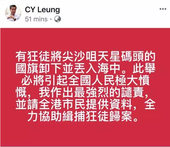 据环球时报报道,8月3日晚间,在得知暴徒将海港城前面旗杆上的国旗扔入海中后,全国政协副主席、香港特区前特首梁振英发帖表达了强烈谴责称:有狂徒将尖沙咀天星码头的国旗卸下并丢入海中。此举必将引起全国人民极大愤慨,我作岀最强烈的谴责,并请全港市民提供资料,全力协助缉捕狂徒归案。