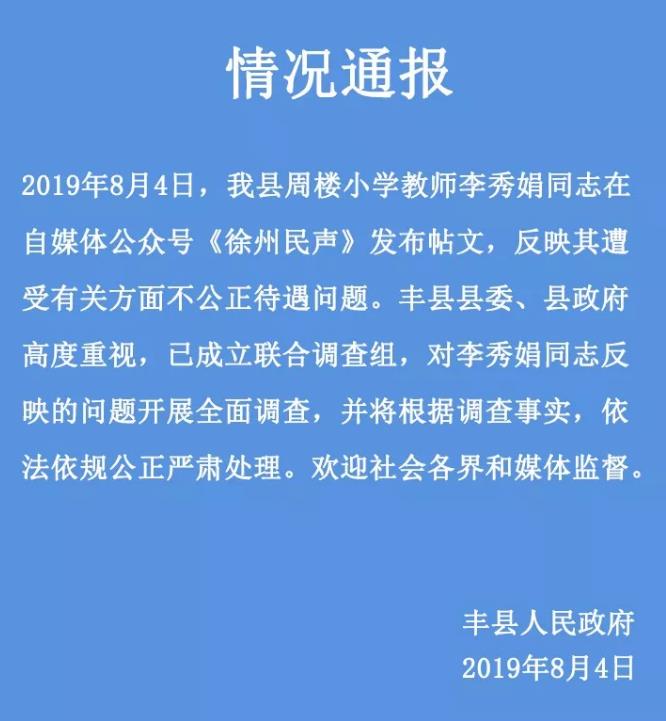 4日下午,丰县人民政府发布情况通报,称丰县县委、县政府高度重视,已成立联合调查组,对李秀娟同志反映的问题开展全面调查,并将依据调查事实,依法依规公正严肃处理。欢迎社会各界和媒体监督。