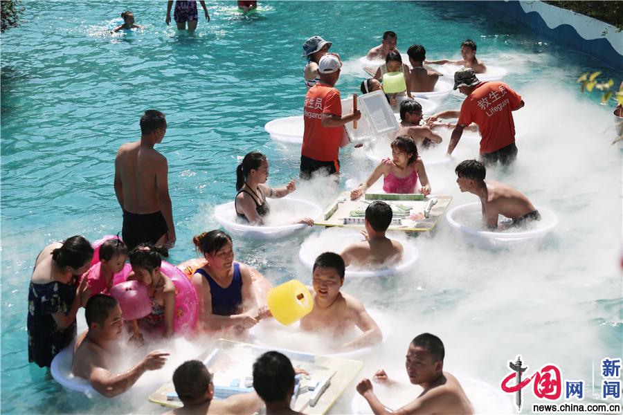 2019年8月13日,民众泡在水中抱着巨型冰糕享受清凉。当日,高温天气模式在重庆全面开启,涪陵红酒小镇一水上乐园的工作人员利用各种饮料冰冻成的巨型冰糕,免费为民众发放。(图片来源:IC photo)