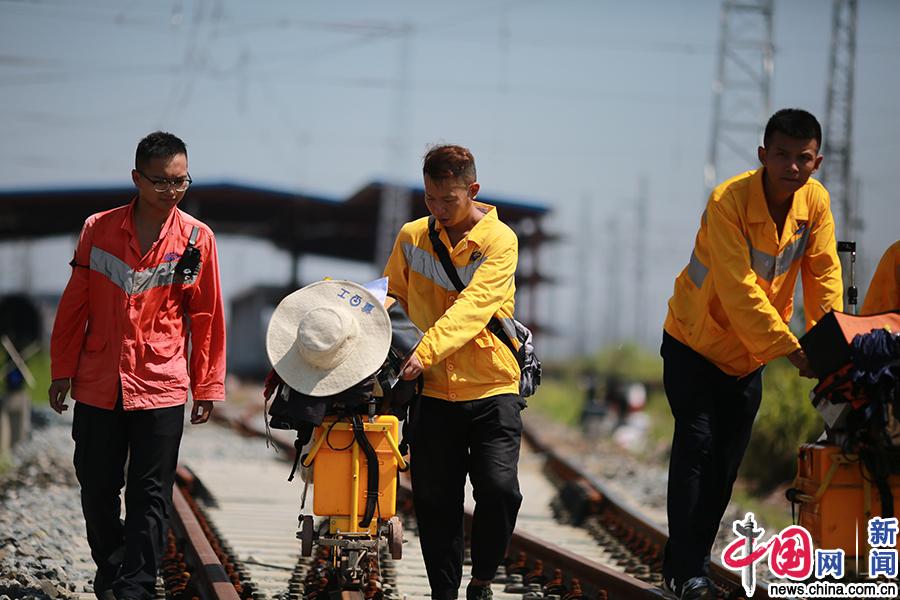 “趁着现在时间还早,我们加油干,一会更热了。”吃完西瓜,工长王杰提议。他们陆续起身,抬着仪器又开始作业,只见他们头顶烈日,用脚步丈量着钢轨的长度,守护着铁道线的安全,脸早已通红,背上也被汗水浸湿了一大片。(通讯员:罗浪/文 苏志刚/摄)