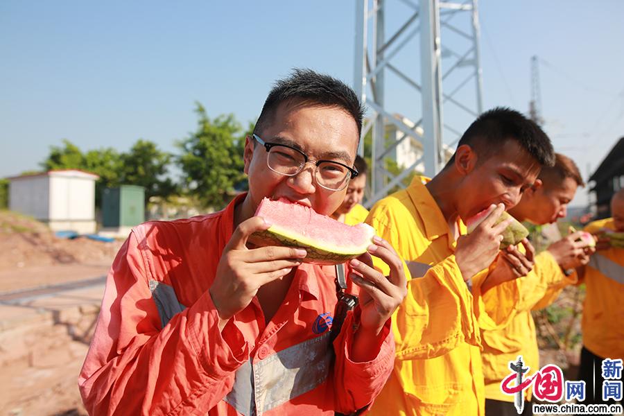 中国铁路成都局集团有限公司重庆工务段探伤车间职工在作业休息时吃西瓜。中国网发 苏志刚/摄