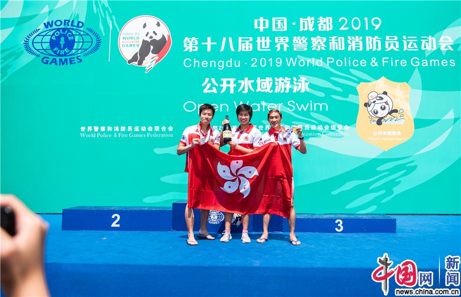 2019年8月15日,成都金堂,在刚刚结束的第十八届世界警察和消防员运动会公开水域游泳比赛项目中,中国香港警队喜获2金、2银的好成绩,向世界展示了香港警察的实力,也同时向世界表明他们有能力维护香港的长治久安。IC photo