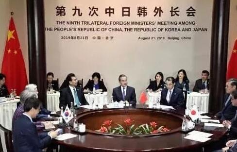 第九次中日韩外长会谈21日在北京郊外的长城脚下举行。国务委员兼外交部长王毅主持会议,韩国外长康京和、日本外相河野太郎出席。