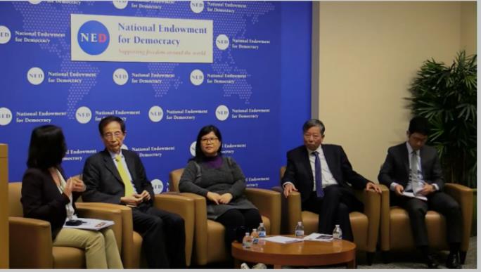 △李柱铭(左二)、麦燕廷(左三)、李卓仁(右二)、罗冠聪(右一)2019年5月14日在美国国家民主基金会作专题演讲
