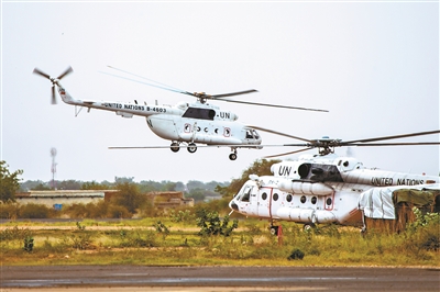 我第2批赴苏丹达尔富尔维和直升机分队直升机在法希尔机场起降。陈凯 摄