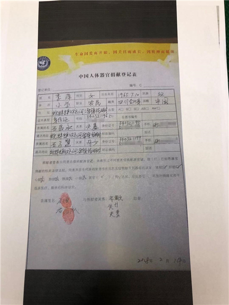 登记表上显示,“我(们)已知悉器官捐献的相关法律法规,同意并完全代表捐献者做出死后无偿捐献下列器官的决定”。后面的多个器官选项中,肝脏和肾脏两项被打了对勾。登记表上有石祥林的父亲石昌永、妹妹石子慧的签字和手印,时间显示是2018年2月14日,即李萍去世的前一天。