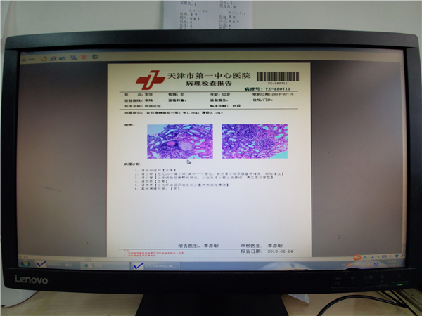 天津市第一中心医院查到的李萍肾脏的病理检查报告。 新京报记者 李云蝶 摄