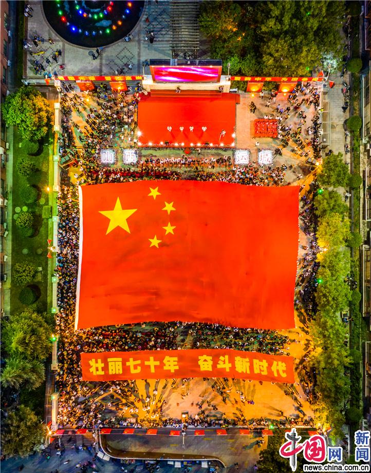 2019年9月22日,山西运城黄金水岸社区居民开展“唱国歌、传国旗、迎国庆”活动,近万名社区居民和各界群众手持国旗,欢聚在小区感恩广场,用歌声和传递国旗的形式,喜迎国庆,庆祝中华人民共和国70周年华诞。尚建周/IC photo