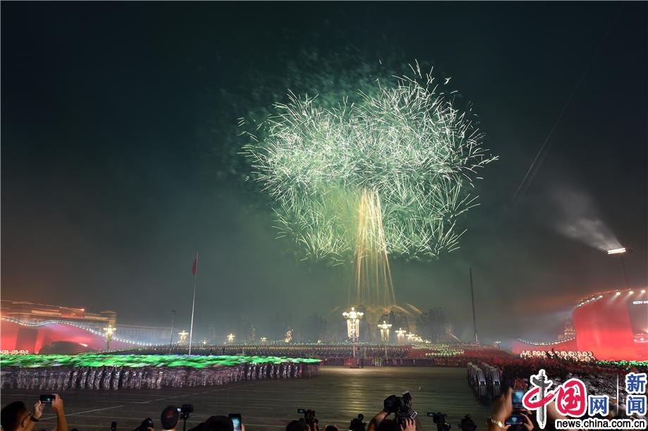 2019年10月1日晚,中国北京,庆祝中华人民共和国成立70周年联欢活动在北京天安门广场举行。烟花璀璨,北京的夜空被盛大而绚丽的烟火照亮,美的超乎想象!大羽/IC photo