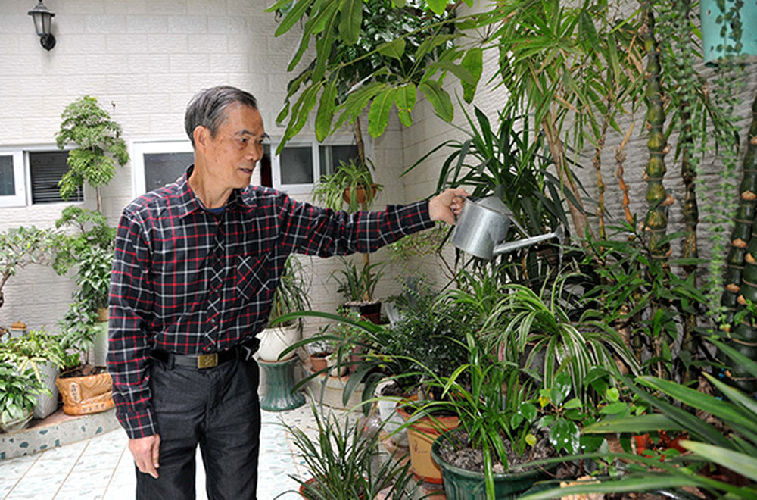 麦贤得在家中浇花(2016年12月27日摄)。新华社记者 周科 摄