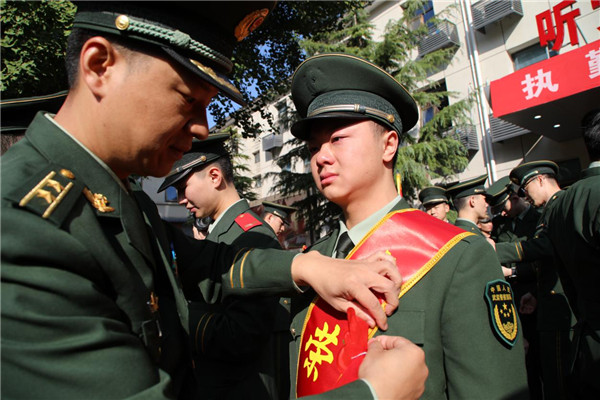 庄严的国歌唱响,退役仪式正式开始,在飘扬的武警部队旗下,支队长梁黔生郑重宣读了退役命令。支队领导为退役士兵卸去警衔、帽徽和领花等,并为大家佩戴上光荣的绶带和大红花。阳光下,橄榄绿与这抹红色交相辉映,格外耀眼。在岗一分钟,就确保安全六十秒,官兵们用实际行动践行了入伍之初的铮铮誓言。