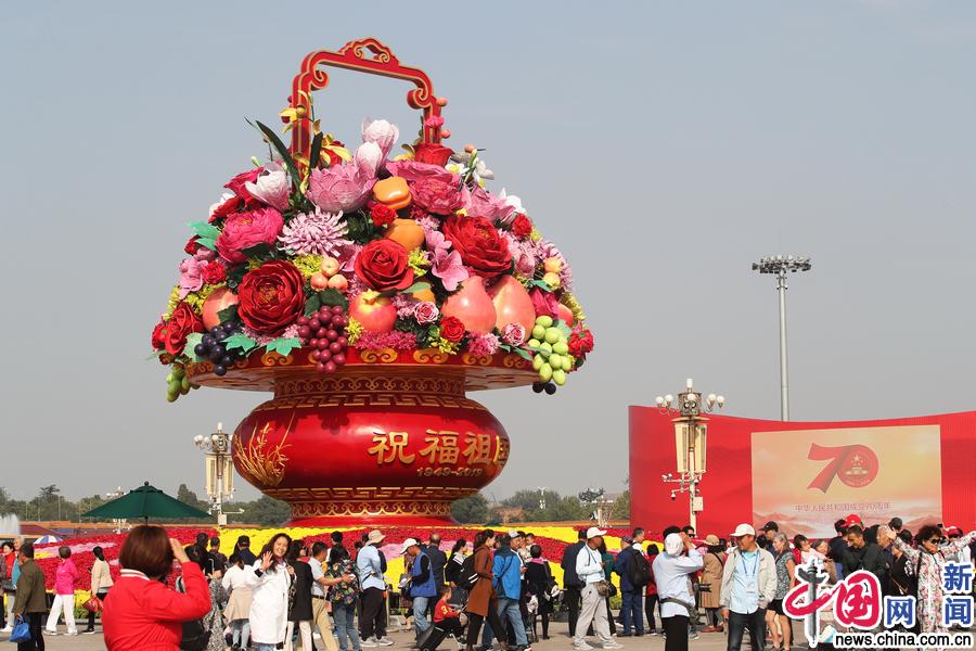 2019年10月9日,北京国庆假期过后,天安门广场人山人海依旧,游客在“祝福祖国”大花篮、红飘带景观雕塑前“打卡”留影热度不减。IC photo