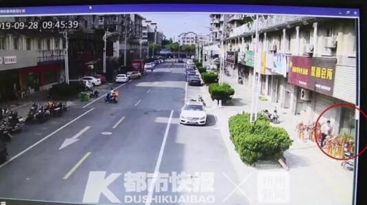 监控画面显示:9月28日9点13分,嫌疑人汪某某走出了受害人胡女士的店里,走到马路中间,汪某某将偷来的手机放到了口袋。