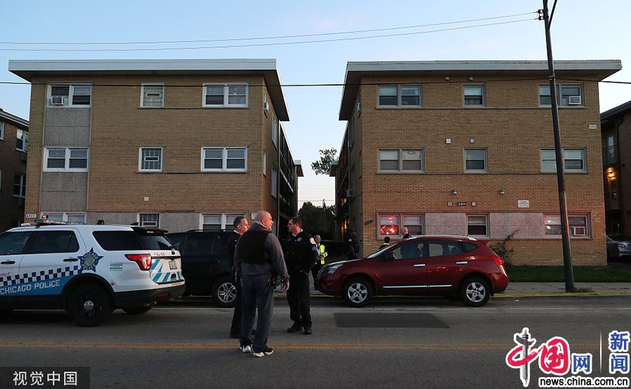 当地时间2019年10月12日、13日,美国芝加哥,警方在枪击案事发公寓楼附近调查。美国芝加哥市西北郊一座公寓楼12日晚发生枪击事件,造成4人死亡、1人重伤。Newscom/视觉中国
